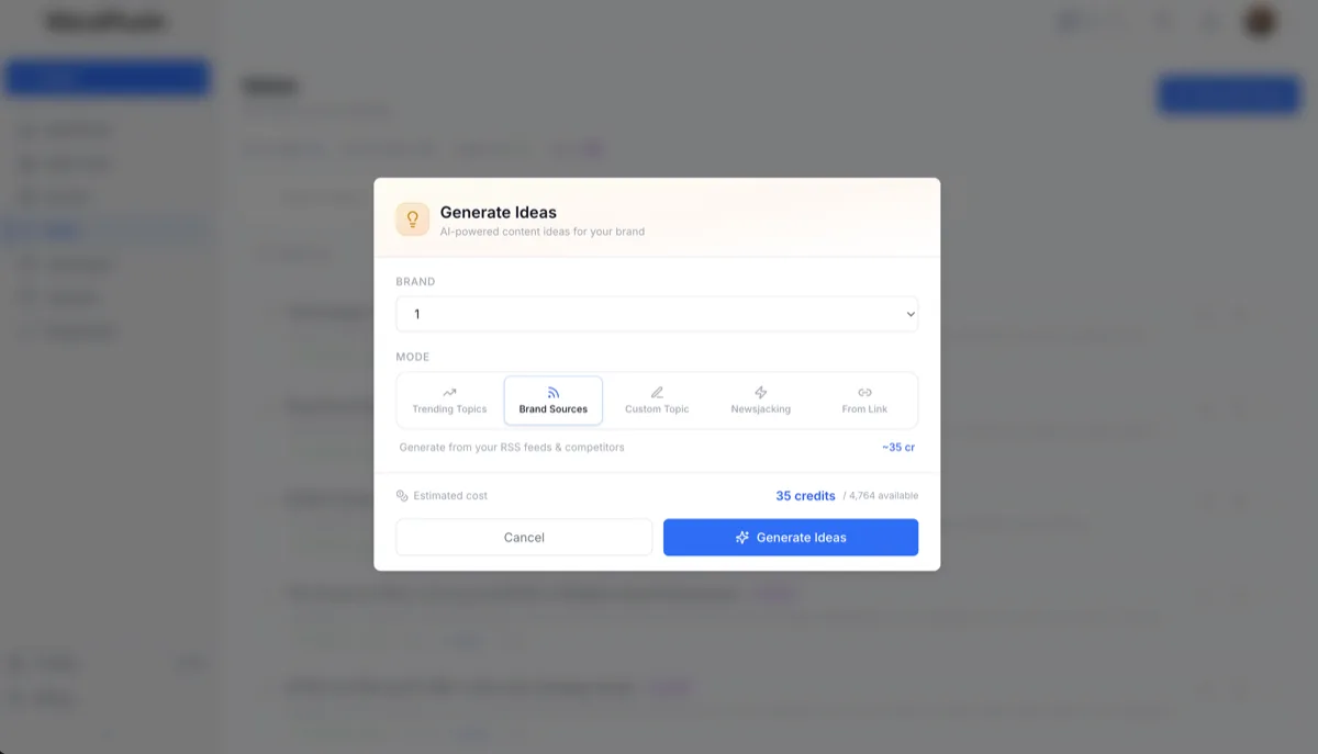 See your first ideas freeOpen WordPush and choose how you want to find inspiration today. Trending topics, your brand feeds, a custom topic, a breaking story, or a URL you spotted. In seconds, you'll have a list of content ideas made for your brand.